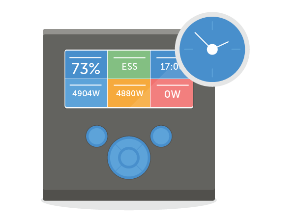 The Color Control GX manages Energy Storage Systems. It keeps back-up batteries at 100% kicks-in during power-cuts; and diverts excess (solar) power to self-consumption - saving you money. For examples and more detailed information see the ESS (Energy Storage System) manual.