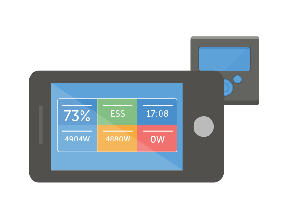 At a single touch, Color Control GX provides an instant overview of your system: battery state of charge; present power consumption; power harvest from PV; power provision from mains/generator.