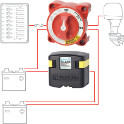 SI-ACR automatically combines batteries during charging, isolates batteries when discharging and when starting engines. The Dual Circuit Plus Battery Switch simplifies the switching of two batteries to OFF or ON while still providing battery isolation between the engine and auxiliary battery. The Combine function can be used to parallel the batteries in the event of a low engine battery.