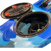 Large rear tank well for storage with uni track rails, two flush mounted fishing rod holders, storage hatch, drainage scupper holes, carry handles and more!