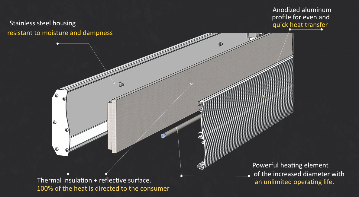 • Mid-Wave Infrared Technology - Delivers direct radiant heat to people and surfaces