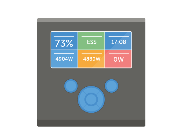 At a single touch, Color Control GX provides an instant overview of your system: battery state of charge; present power consumption; power harvest from PV; power provision from mains/generator.